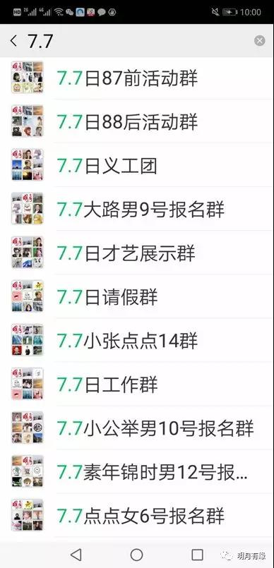 图1-2:明月群为这次活动组建了14个报名群、2个活动群和近10个工作群(策划部、义工团、工作群、才艺展示群、婚纱表演群、请假群等)。